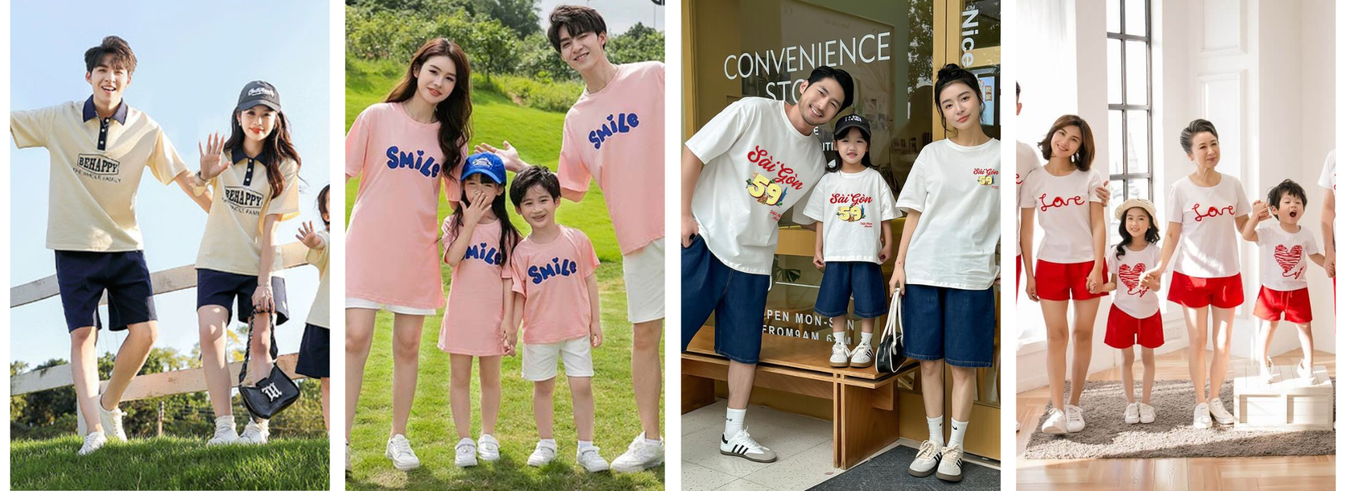 Gợi ý: Ba/mẹ mặc quần jean tối màu, bé mặc chân váy/short sáng; thêm phụ kiện đồng điệu (nón bucket, khăn bandana) để tăng “chất album”. Hãy chọn một tone nền chủ đạo để ảnh đồng nhất, làm bật slogan Áo gia đình – We are family.